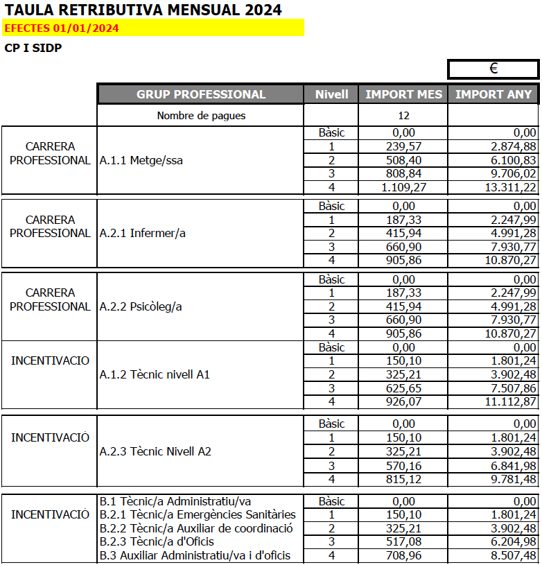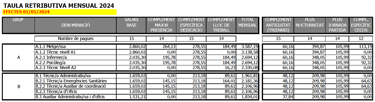 Taules retributives ANUALS Metge/essa, Infermer/a, Psicòleg/a, Tècnic Nivell A1, Tècnic Nivell A2, TES, TAC, TO, Auxiliar administratiu