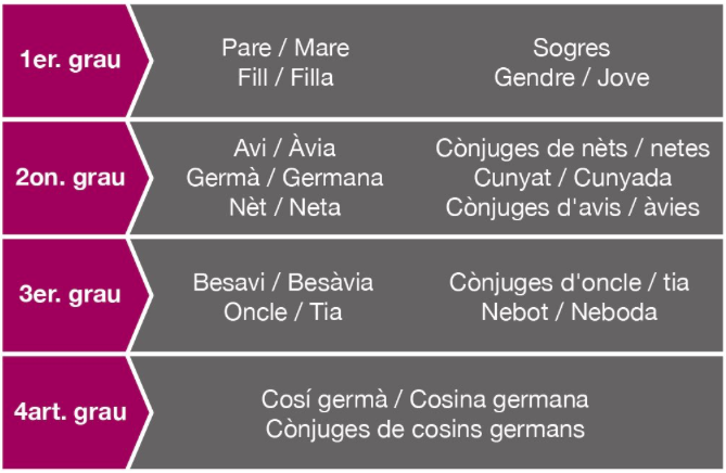 Aquí trobaràs els diferents graus de consanguinitat i afinitat que has de tenir en compte ja que influeixen alhora de gaudir de permisos i llicències.